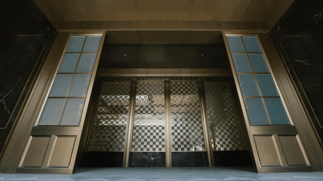 深咖色定制纹样金属打造,气势磅礴!门庭内「水韵莲径」架空走廊以石材景墙与金属格栅构成曲径通幽的通道,极具东方韵味~编辑