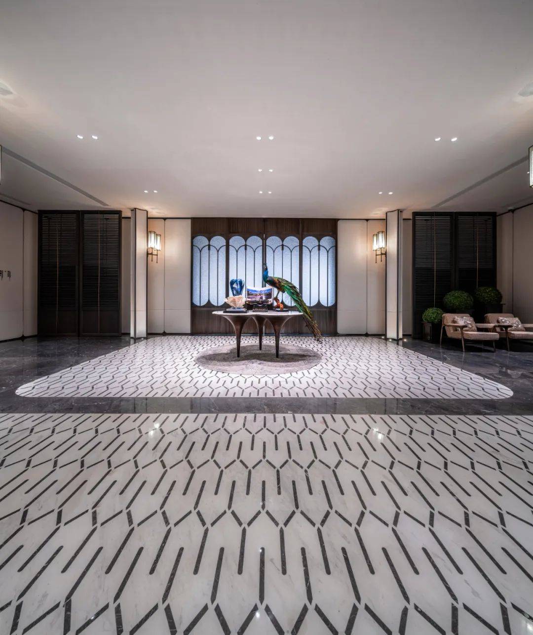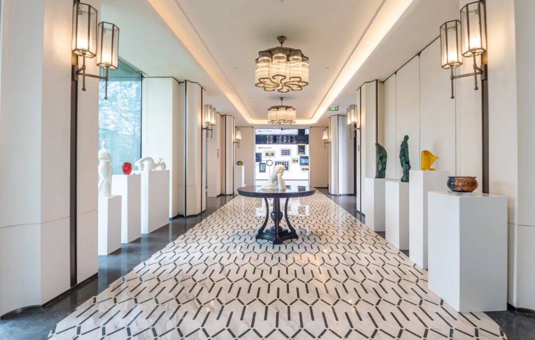 约500㎡艺术馆般泳池,天花、墙面以现代摩登的手法,抽取上海海派建筑造型为元素,打造充满静奢韵律的造型,搭配泳道尽端景泰蓝奢石背景墙,勾勒出一处臻享静美的精神之所。