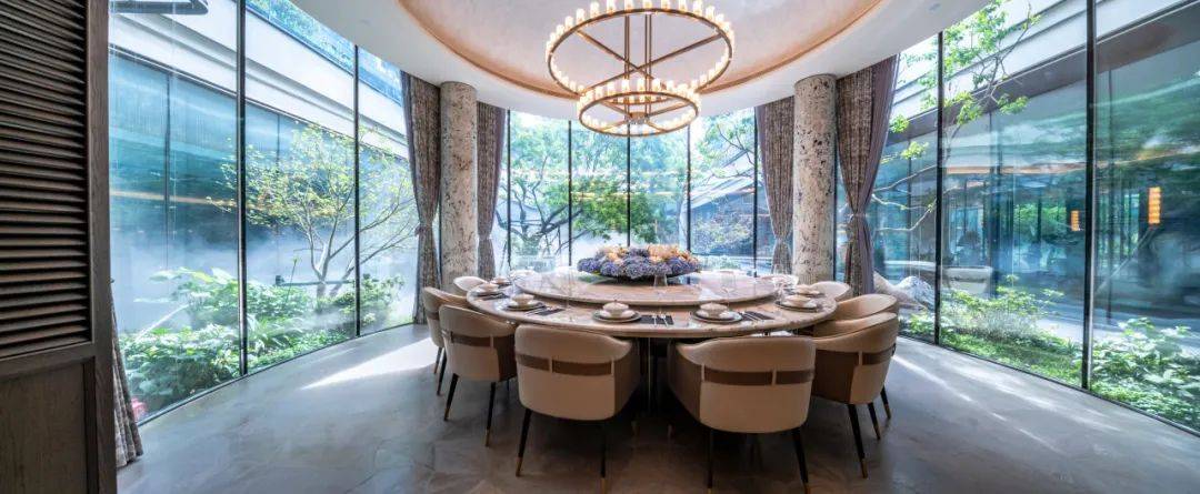 私宴厅取“团圆”之意,打破常规的私宴厅形制,运用圆桌、圆灯、圆盘等元素,搭配270度环景落地窗,营造浓郁的海派东方气场,带来优雅的宴饮氛围。