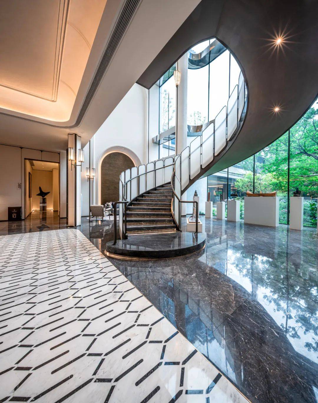 再现邬达克的武康印象。邬达克作品誉为“上海符号”,上海·招商臻境,汲取其设计的武康大楼弧线精粹,融合现代曲线与玻璃工法,写意百年上海的优雅。邬达克水院落如同一面明镜,静静倒映经典海派的时空转译。