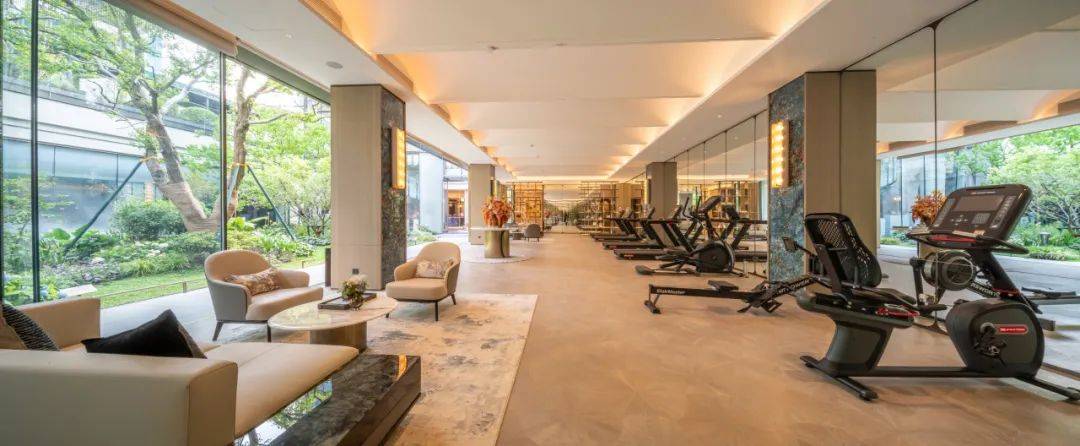 健身空间,搭配海派砖花地砖,极尽静奢风潮。大面积落地玻璃与下沉庭院的浓荫深度交融,或瑜伽、或健身,让心灵在酣畅淋漓中重回宁静与自在。