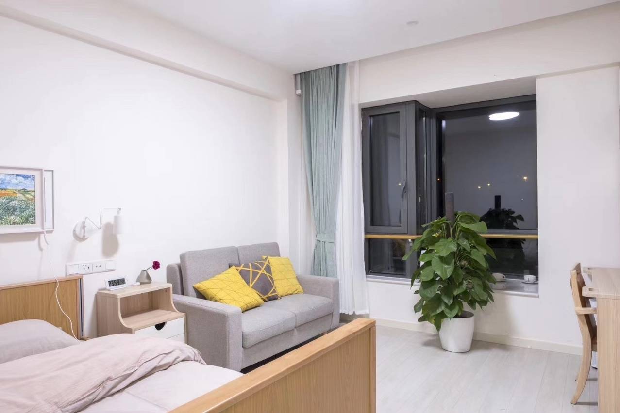 户型设计贴心合理,所有户型均朝阳,采光充足、通风效果好,避免了潮湿、阴暗的问题,长辈住起来更舒适。每个户型都配备独立厨房和无障碍卫浴空间,床榻加宽、床垫软硬适度,家具质感柔和,避免尖锐棱角,从细节处保护长辈的安全;电视、冰箱、空调、电话、专业养老用床、衣柜、写字台等设施一应俱全,还有适老化设计,比如走廊扶手、卫生间防滑、一键呼叫等,全方位保障长辈的生活便利和安全。同时,配备两部医用电梯,确保紧急情况下能够快速转运长辈,保障安全。