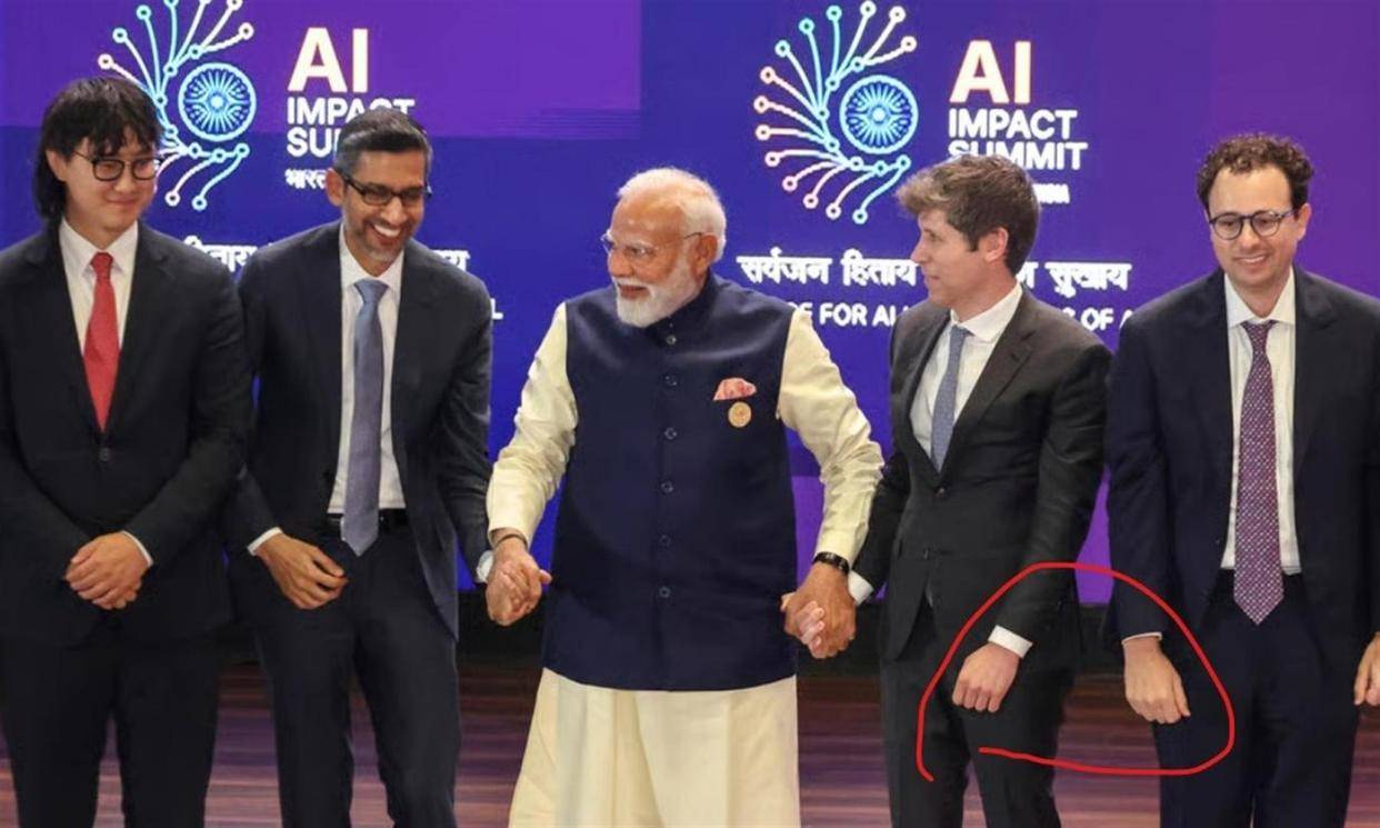 2月19日的开幕式合影环节,为这场峰会增添了另一抹尴尬的色彩。在印度总理莫迪、法国总统马克龙、谷歌CEO桑达尔·皮查伊等政商领袖一同登台,进行惯例性的峰会合影时,出现了一个微妙的插曲。现场照片和视频显示,众人站成一排,手牵手举过头顶,但站在舞台中央的OpenAI公司首席执行官萨姆·奥尔特曼,和他身边的Anthropic公司首席执行官达里奥·阿莫代伊,两人的手掌却没有互握。他们各自举起了握拳的胳臂,导致象征团结的“手链”出现了一个明显的“断点”。阿莫代伊曾是OpenAI的副总裁,于2021年离职并带走多名研究人员创立了Anthropic,两家公司在AI大模型领域是直接的竞争对手。这一被媒体称为“肢体语言插曲”的瞬间,很快在网络上引发热议和调侃,被解读为硅谷巨头之间深刻分歧的直观呈现。奥尔特曼后来表示,他“当时不知道该怎么做”,而阿莫代伊则未对此置评。