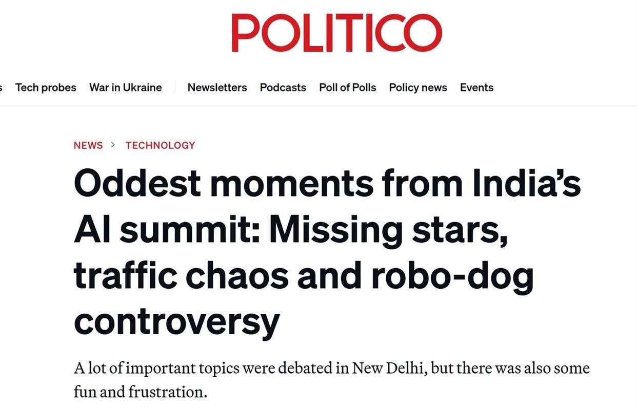 美国“政客网”在2月20日的报道中,对这场峰会进行了近乎全方位的嘲讽。文章开篇就称,在经历了紧张且“高风险”的一周后,峰会落下帷幕,“留下的是印度宏大的愿景,以及一连串未解之谜”。该报道总结了峰会台下的复杂气氛:缺少重量级嘉宾、安保封锁与德里混乱的交通纠缠在一起、会议日程与全球政治事件撞车,还有一场演示意外变成了网络“梗图”素材。报道中甚至意有所指地提到了法国总统马克龙在印度戴墨镜晨跑的花边新闻,并评论道“并非所有人工智能的事情都发生在舞台上”,暗讽这场峰会本身乏善可陈。返回搜狐,查看更多