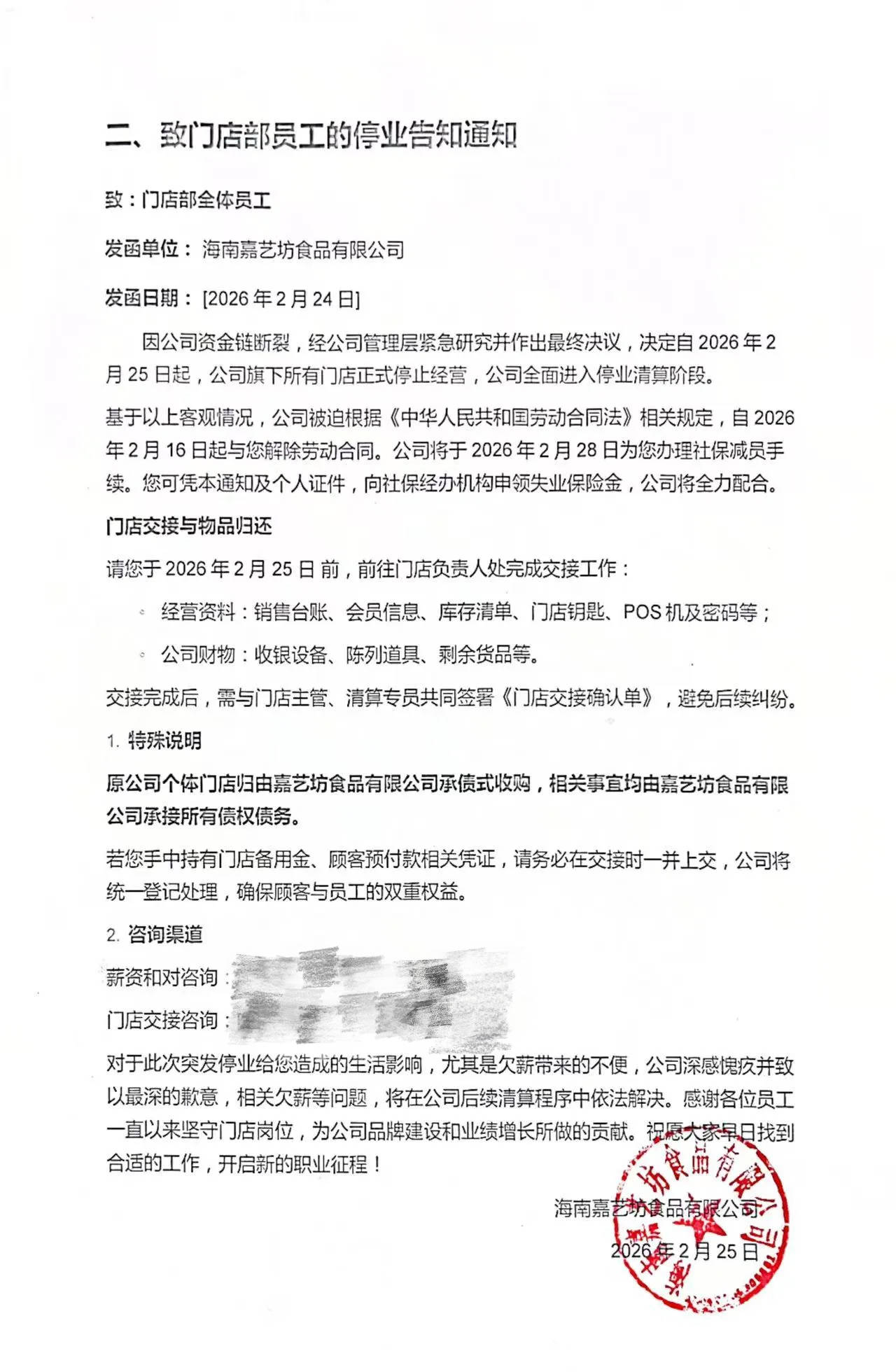 不过,嘉艺坊在一份《致门店部员工的停业告知通知》中表示,原公司个体门店归由海南嘉艺坊食品有限公司承债式收购,相关事宜均由嘉艺坊食品有限公司承接所有债权债务。若消费者手中持有门店备用金、顾客预付款相关凭证,请务必在交接时一并上交,公司将统一登记处理,确保顾客与员工的双重权益。