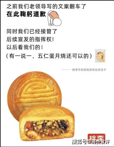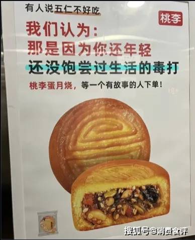 公司在推出的蛋月烧产品广告语写道“有人说五仁不好吃,我们认为:那是因为你还年轻,还没饱尝过生活的毒打”。