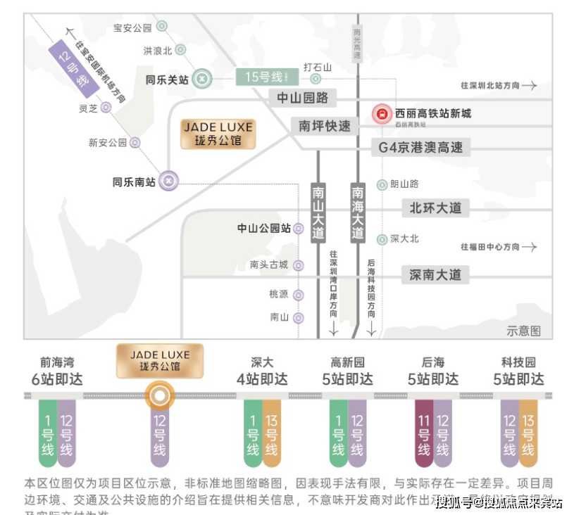 项目拥有“3地铁+3枢纽+2纵4横路网”的多维立体交通体系,通勤效率与出行便捷度兼具。已运营的地铁12号线分钟即可抵达,乘坐该线分钟可达科技园核心区,5站约15分钟覆盖高新园,无缝衔接南山科创核心板块。在建的地铁15号线月开通,作为深圳“一环线”,未来将串联宝中、前海、深圳湾、西丽等核心区域,进一步拓宽出行辐射范围;规划中的24号线站可直达高新园,强化与科技产业带的紧密连接。枢纽方面,项目距离在建的西丽高铁站约2.3公里,预计2028年建成通车后,1小时可抵达广州、东莞等大湾区城市;临近宝安国际机场(约15公里)和深圳湾口岸(约10公里),满足商务出行与跨境需求。路网规划上,依托“2纵4横”交通动脉,2纵即中山园路链接南山大道、南海大道,4横包括京港澳高速、南坪快速、北环大道、深南大道,自驾15分钟可覆盖福田中心区、宝安中心区等区域,至科技园约12分钟,前海约18分钟,留仙洞总部基地约10分钟,高效衔接城市各大核心板块。